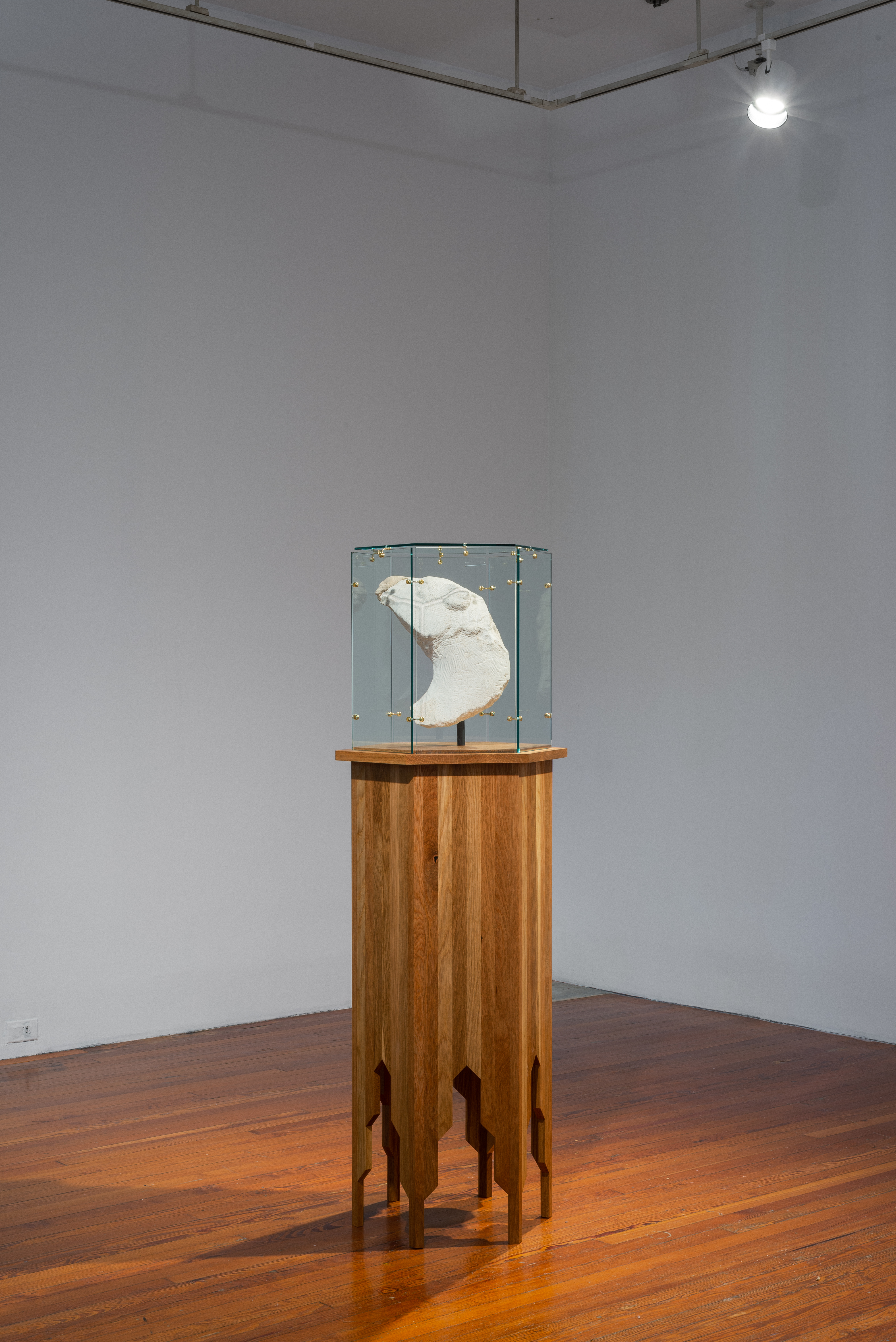 The work I was asked to design and produce is a display case, which holds a fragment of a limestone sculpture by Zakaria Almoutlak, and is imagined as a contemporary interpretation of a traditional Turkish tea table. The inlaid wood and decorative details of the traditional tables are subtly referenced by laminated strips of white oak which are cut at an angle on the ends, creating the distinctive legs. The glass is held together with delicate 3D printed brass connectors which allow the panes to float.