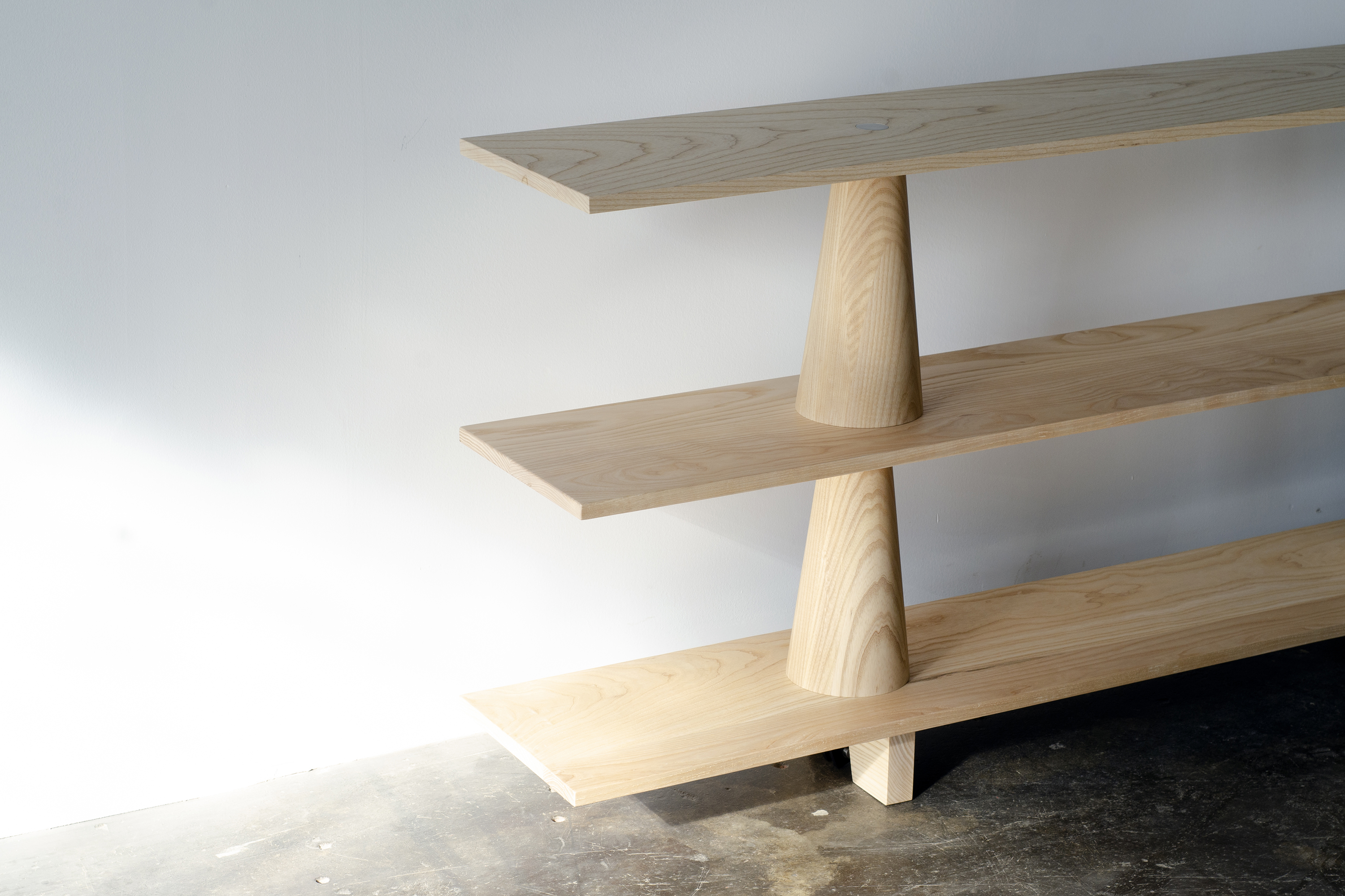 Pylon shelving consists of overhanging, interleaved shelves grounded by stacked, conical spacers. These solid elements add visual weight and totemic structure to the system’s organizational logic. Assembling easily, the elements are simply stacked and clamped together with cam levers.